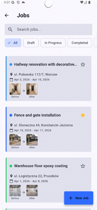 Photograph the site before you start and after you finish. JobDone pairs the photos automatically so the client sees exactly what changed. No more arguments about scope or quality.